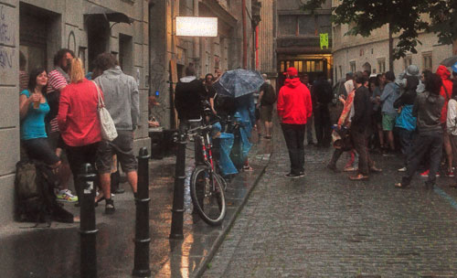 Chega a polícia. Um par de homens bem avantajados aproxima-se e fala com um dos organizadores. Medem os decibeis no local, preenchem a papelada, tiram um par de fotografias para o relatório de ocorrência e vão-se embora. A chuva intensifica-se mas a multidão, em vez de dispersar, está cada vez mais grossa. Bebo um último golo de cerveja Branik pelo gargalo da garrafa de dois litros que a Lucia tem ali, para a sua comunidade de amigos. Declino mais uma oferta de uma passa num charro que roda pelo grupo. Preparo-me para partir. Quando me esgueiro por entre as pessoas, dou de caras com alguém conhecido, um indiano que cruzou a minha vida quando me mudei para Praga, há seis anos. Trocamos algumas palavras e afasto-me. Mais à frente ouço chamar…. é o Nicola, antigo companheiro da Lucia, que também vivia lá no apartamento de Letna. E Praga é isto… o inesperado, a dinâmica, o carácter de uma pequena aldeia numa cidade de milhão e meio de habitantes.