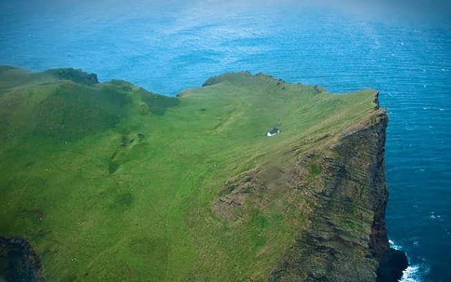 Vêem um pontinho na imagem aqui em cima? Um pequeno ponto branco… o que é? Nem mais nem menos do que uma singela casinha, sozinha, perdida numa ilha islandesa. Conseguem imaginar a solidão do que ali habitam, rodeados pelo azul do mar, pelo verde no verão, pelo branco dos gelos e das neves em boa parte do ano, alguns dias mal vendo a luz do sol?