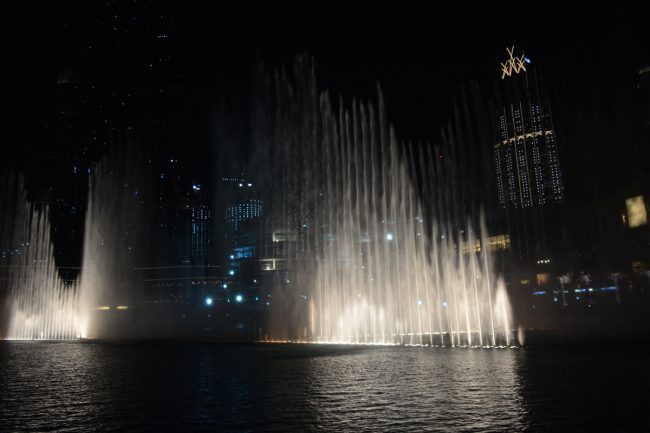 A viagem de regresso traz-nos já quase de noite. Já na margem certa do canal ainda cirandamos, até porque entretanto o mercado já funciona a todo o vapor. Aquilo é claramente uma zona de residentes indianos. Paramos para um chá masala, delicioso, barato, num café muito local. E de seguida, toca a andar rua acima, para o metro que nos há-de levar ao Dubai Shopping. Falta acertar as contas com mais uma das coisas que o Ashraf nos tinha recomendado: o espectáculo de repuxos da fonte.