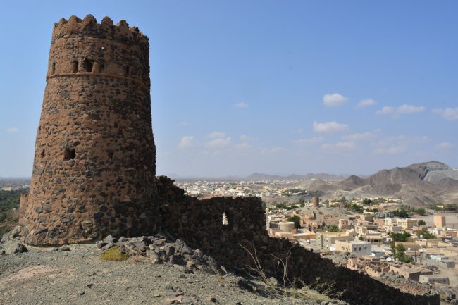 Trepei até ao topo do monte onde se encontram as duas torres mais altas e apreciei a vista de lá de cima, com Al Mudhaireb (atenção que existem diversas formas de se escrever este nome – é sempre complicado aplicar a grafia latina a nomes árabes).