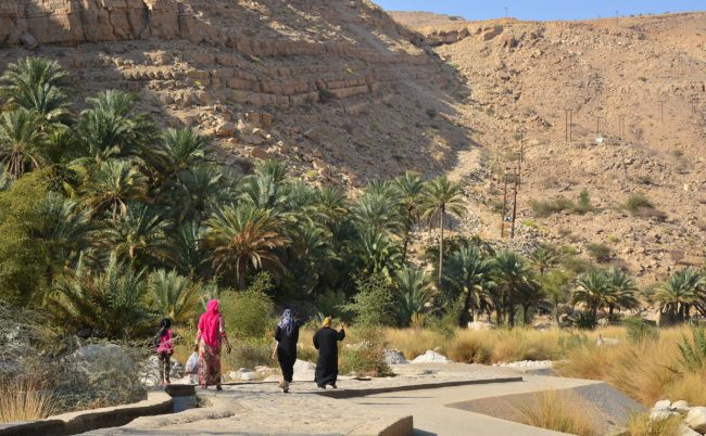 Depois é caminhar um pouco, umas centenas de metros, pelo verde luxuriante, pelo meio das palmeiras e relva, lado a lado com canais de água, junto a pequenos lagos que se formam. Aos fins-de-semana o local enche-se de famílias omanis que ali procuram a frescura que lhes é negada nas suas localidades mas mesmo neste dia se encontrava por lá alguma gente.