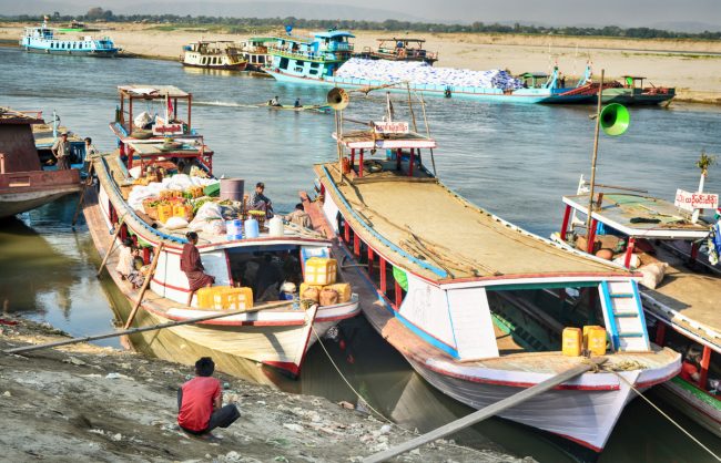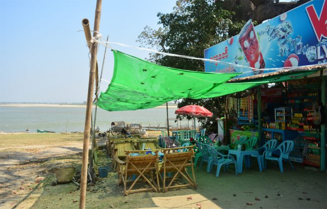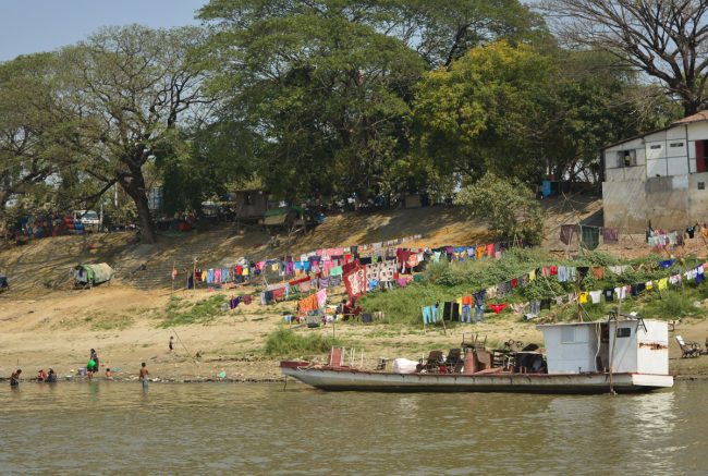 Cheguei ali à margem do rio e fiquei logo interessado na azáfama que vi. Tantos barcos e imensas pessoas, figurinhas, como formigas, para trás e para a frente, carregando e descarregando, tirando água do leito, nadando, cozinhando, correndo, dormindo. Esta foi a parte boa. A má foi olhar em redor e ver autocarros de turistas a chegar de enxurrada, grupos de asiáticos no seu melhor estereótipo a encher barcos que logo se punham ao largo, em direcção a Mingun. E enquanto isto se repetia, uma pequena multidão para o “meu” barco ia-se juntando. Um grupo mais simpático, mas mesmo assim demasiado numeroso para o meu conforto.
