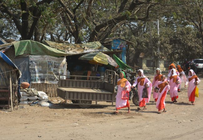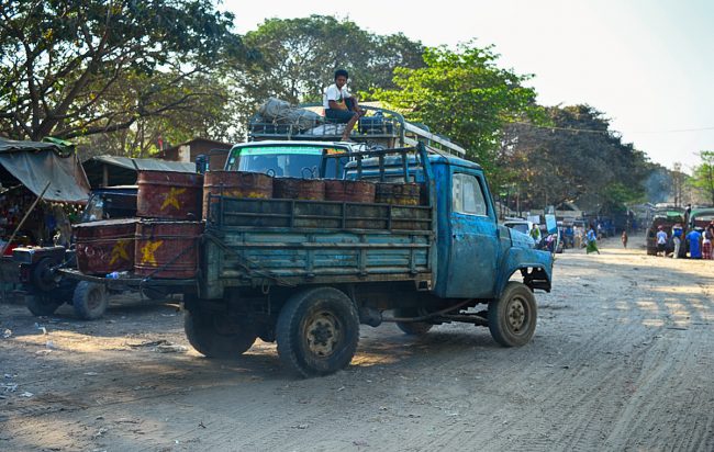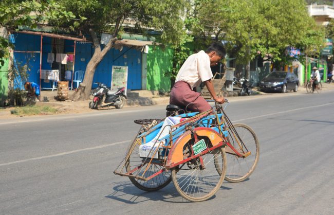 Passam atrás de mim dois cavaleiros, o que é uma visão inesperada em Myanmar. Cavalos bem tratados, todos prontos para uma festa. E depois vem um camião com um altifalante de dimensões míticas que faz um barulho à altura… a anunciar alguma coisa, não sei.