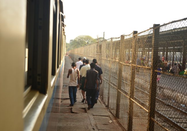 Sente-se o final do dia a chegar quando o comboio deixa Mandalay para trás. Ainda tiro uma mão cheia de fotos. As janelas vão totalmente abertas, é o ar condicionado que temos. Está uma tarde agradável, e a luz do sol vai-se alaranjando à medida que perde intensidade. A temperatura é ideal. No corredor passam vendedoras. Ninguém vai ter fome no comboio Mandalay-Rangoon.