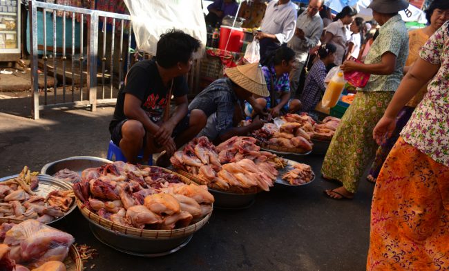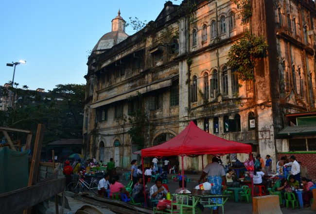 Vamos por ruas já conhecidas, da primeira passagem pela cidade. O ambiente está fantástico. Dá-me a ideia que as pessoas de Rangoon não são de ir meter-se em casa depois do trabalho. Ficam pelo centro, se não todas, se não talvez a maioria, pelo menos muitas. E assim todas aquelas ruas estão cheias de vida. As tascas improvisadas encontram-se por todo o lado, sempre as mesas e cadeiras de plástico, cozinhas reinventadas a cada dia.