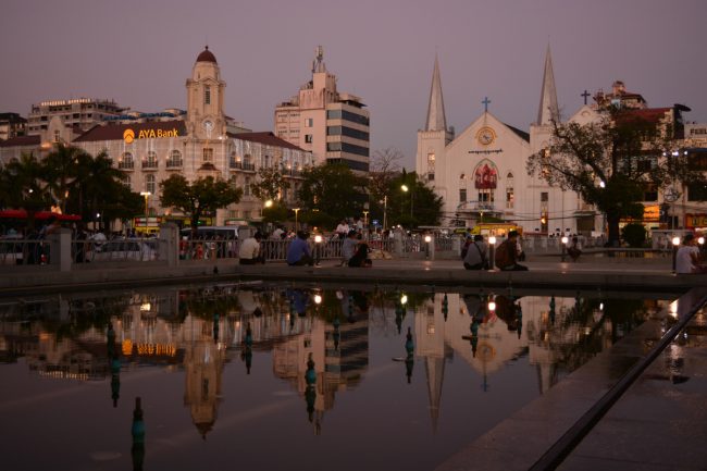 Lá fora a cidade está para fechar. Inicia-se a hora de ponta, o regresso a casa, o encerramento de lojas e escritórios. Passamos junto a uma torre altissima, pelo menos para os padrões de Rangoon, que despeja para a rua catadupas de funcionários que passaram o dia nas empresas ali estabelecidas.