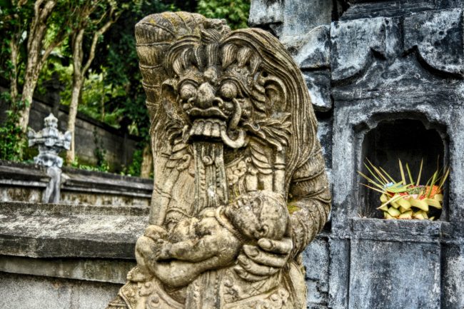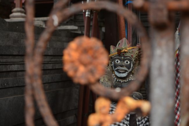 Volto pelo mesmo caminho, tão agradável como à vinda. Faço uso de um mapa fotocopiado e vou em busca de templos. Como a menina do hostel disse, “templos é o que não falta por aí”. O primeiro é logo ali ao fundo da rua. É aquilo, o templo indonésio que morava no meu imaginário. Quase. Preferia algo assim perdido no meio da selva e também gostaria que não chovesse nesse templo dos meus sonhos. Mas para já é o que se pode arranjar. Um templo que parece estar mais ou menos em obras de restauro, mas não naquele dia. À beira de uma rua onde passam scooters e pessoas a pé. E com alguma chuva para perturbar a minha fotografia. Ah! E também gostava que as estatuária no “meu” templo fosse de pedra talhada e não feita de cimento com formas obtidas por um molde. Mas é o que se pode arranjar e terá que servir.