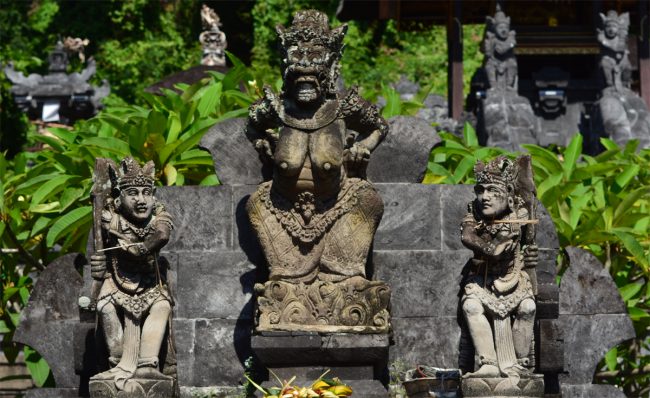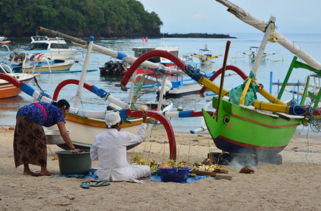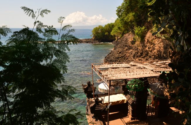 Padang Bai já se tinha definido na véspera e para o dia de hoje sabia mais ou menos com o que contar. Lá em cima os deus da meteorologia sorriram-me logo pela manhã, oferecendo um céu azul como já há uns tempos que não via. Tomei o pequeno-almoço, a incontornável panqueca de banana com mel e o sumo de tamarindo e fiz-me ao caminho. Foi uma manhã com muitos templos, não só revisitando os que já tinha visto no dia anterior, com pouca luz e alguma chuva, como descobrindo outros, uns de que a minha companheira francesa de viagem até aqui me tinha falado, junto à água, já fora da aldeia.