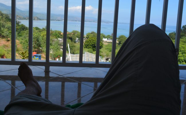 Fui portanto a casa, limpei-me, deixei-me estar um pouco no terraço a descansar, a ver a paisagem, o mar mesmo em frente e Dili já mais longe, para a esquerda. Desci pela segunda vez para a estrada. Li um bocado nas cadeirinhas da praia.