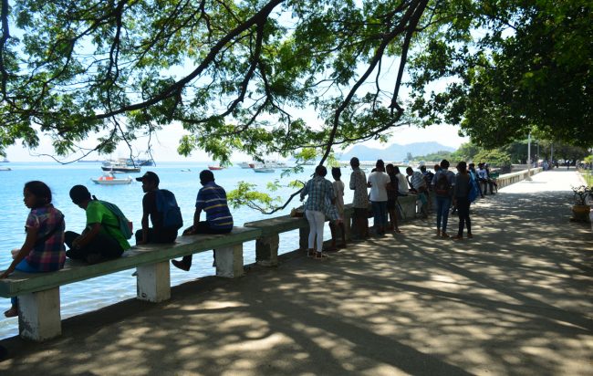 Vou andando à beira-mar, uma espécie de passadiço marginal, muito cheio de timorenses que passam ali tempo de lazer. Há jovens, claramente alunos de alguma escola próxima, e no mar pesca-se. À linha e com mergulho.