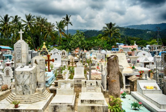 E agora estou pronto a afastar-me do centro e caminhar até ao Cemitério de Santa Cruz, onde tanta coisa aconteceu. Por si, despido do seu significado histórico, o cemitério não é especialmente interessante. Alguns pobres homens dormem sobre as campas, gente que provavelmente não tem onde ficar e que chama de “lar” a este local. É um cemitério católico, com um pano de fundo tropical, e pouco mais o distingue de um cemitério português.