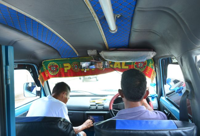 Lá ia o condutor e o seu ajudante e uns dois ou três passageiros. Os bancos são laterais, corridos. À frente um cachecol da Seleção Nacional Portuguesa em grande destaque. O percurso é pequeno. São recolhidos mais passageiros que se dirigem para a cidade. O bilhete custa USD 0,25. Ah sim, em Timor Leste a moeda é o Dólar Americano.