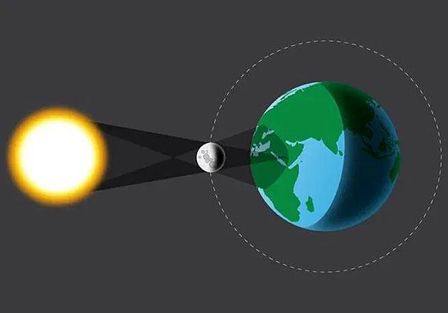 O eclipse solar acontece sempre na fase da lua nova, quando esta se encontra entre o Planeta Terra e o Sol. Por conta desse posicionamento em linha recta de Sol-Lua-Terra, a Lua encobre a luz solar por um curto período, o que gera uma sombra numa pequena parte do território terrestre. |